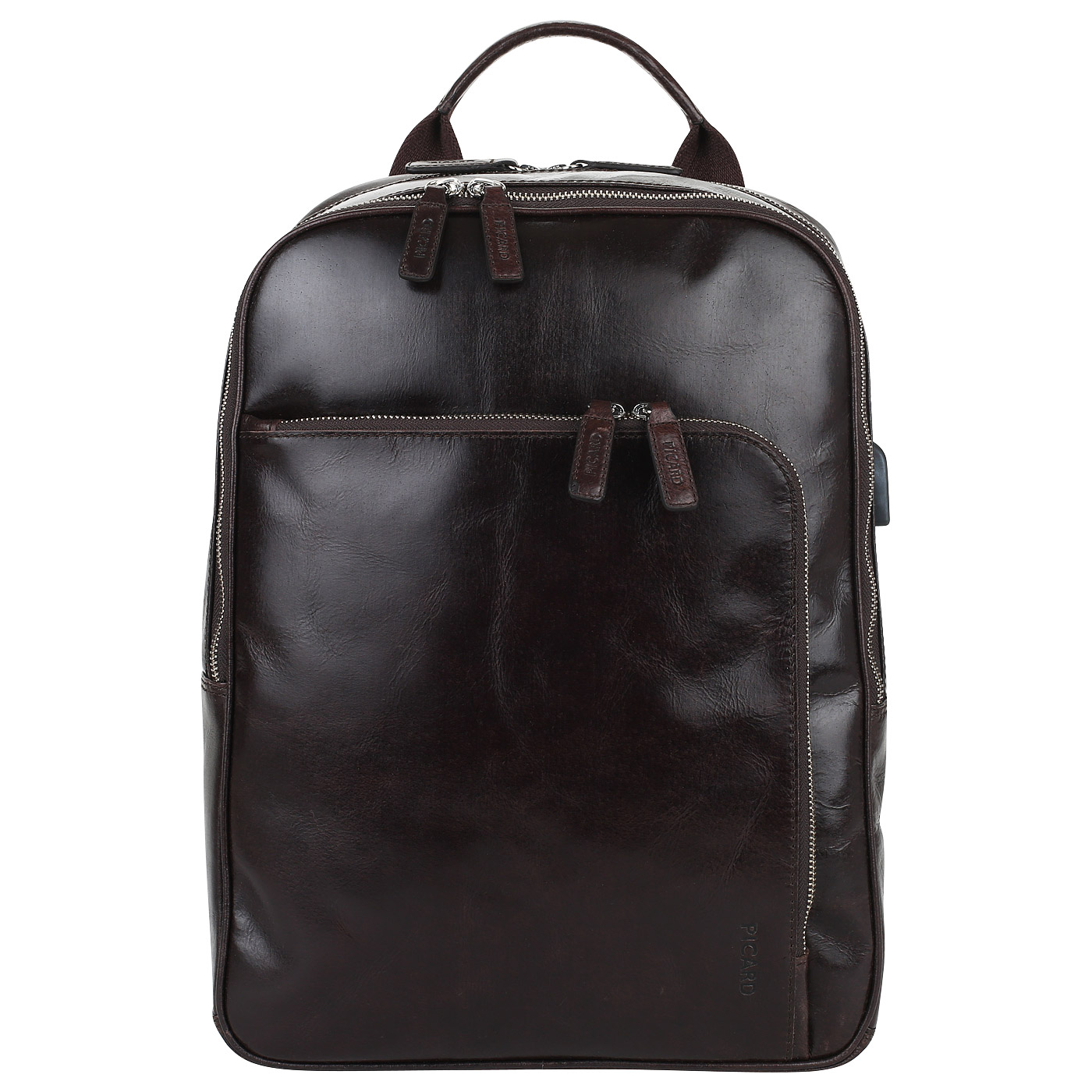 Элегантный деловой рюкзак с функциональным дизайном — достойный конкурент обычной сумке и порой куда более удобен в использовании. Коричневая модель из глянцевой натуральной кожи поделена на два отдела, каждый застегивается на двойную молнию. Внутри помещается набор разноразмерных карманов, включая кармашки для карточек, держатели для ручек и карман с фиксатором для планшета и ноутбука. В комплект входит USB-кабель. К передней панели примыкает большой накладной карман на молнии, на задней стенке имеется прорезной карман на молнии и крепление для ручки чемодана. Длина плечевых лямок регулируется.