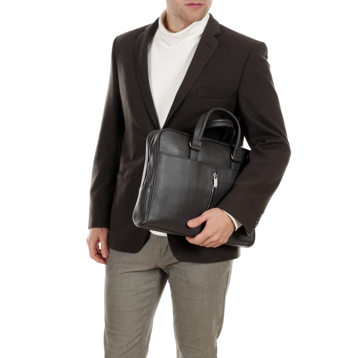Стильная кожаная сумка создана специально для деловых мужчин! Съемный регулируемый плечевой ремешок позволяет носить сумку как на плече, так и за короткие ручки. Закрывается двойной молнией. Внутри один отдел, в котором карман на молнии, открытые кармашки и мягкий карман для ноутбука с держателем.